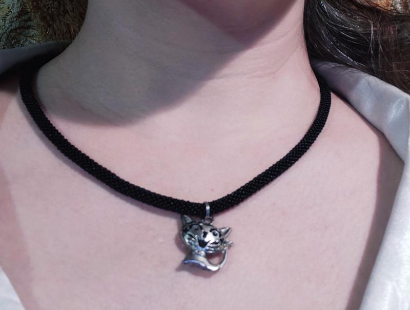 Чорне кольє ручної роботи в'язане гачком з дрібного (р-р 13) чеського бісеру на капроновій нитці "титан" з кулоном "кішечка". Універсальний аксесуар під будь-який одяг для грайливого настрою. Довжина кольє 48 див.