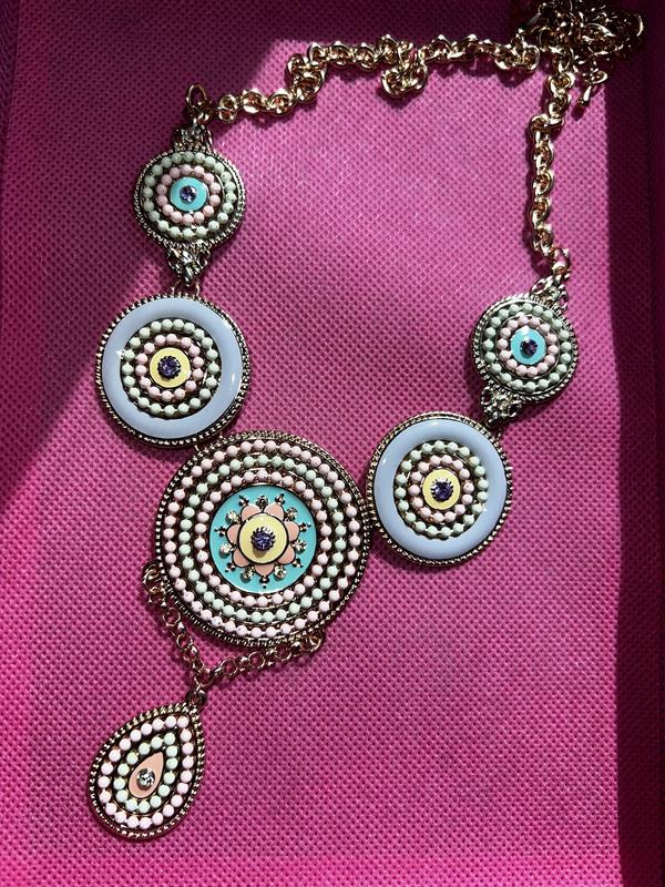 Яркий летний колье: эмаль, камни, позолота. Длина 45 см + 8 см Диаметр кругов 4, 3 и 2 см