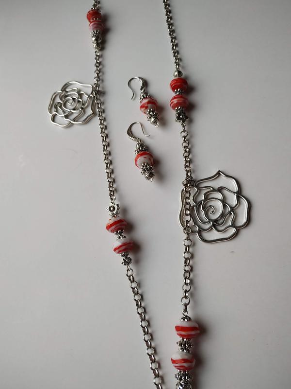Изящный легкий сортуар и серьги из цветочных декоративных элементов и бело-красных граненых бусин. Дополнит Ваш повседневный образ и не оставит незамеченной. При заказе этого ожерелья я с радостью вложу один из handmade подарков из моей коллекции украшений ручной работы.