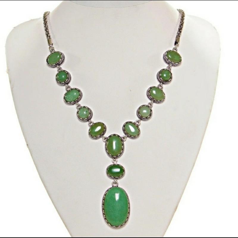 Колье с Нефритом в мельхиоре, овальные камни 3,5х2,5-2,2х1,7-1,2х1,7см, L- 50см