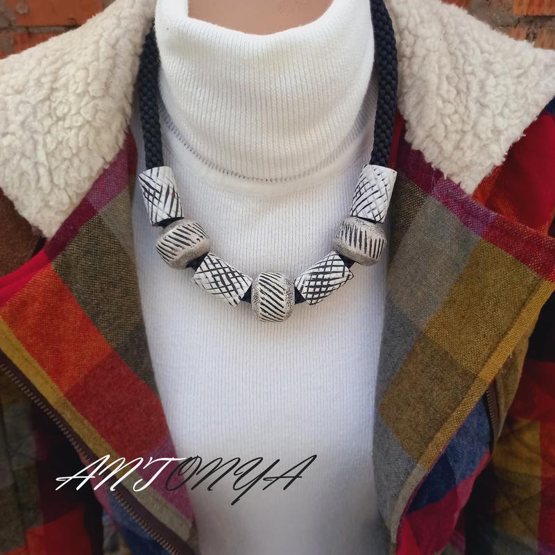 Стильное колье с бусинами-цилиндрами. Бусины-цилиндры выполнены из запекаемой полимерной глины. Длина колье около 48 см, плюс удлинительная цепочка 7 см. колье собрано на шнуре кумихимо ручной работы. Это колье -оригинальный и стильный подарок любимой девушке, жене, подруге, сестре на день рождения, на годовщину свадьбы, на юбилей, на 8 марта. Необычный подарок, дизайнерское украшение, эксклюзивный подарок, авторское украшение.