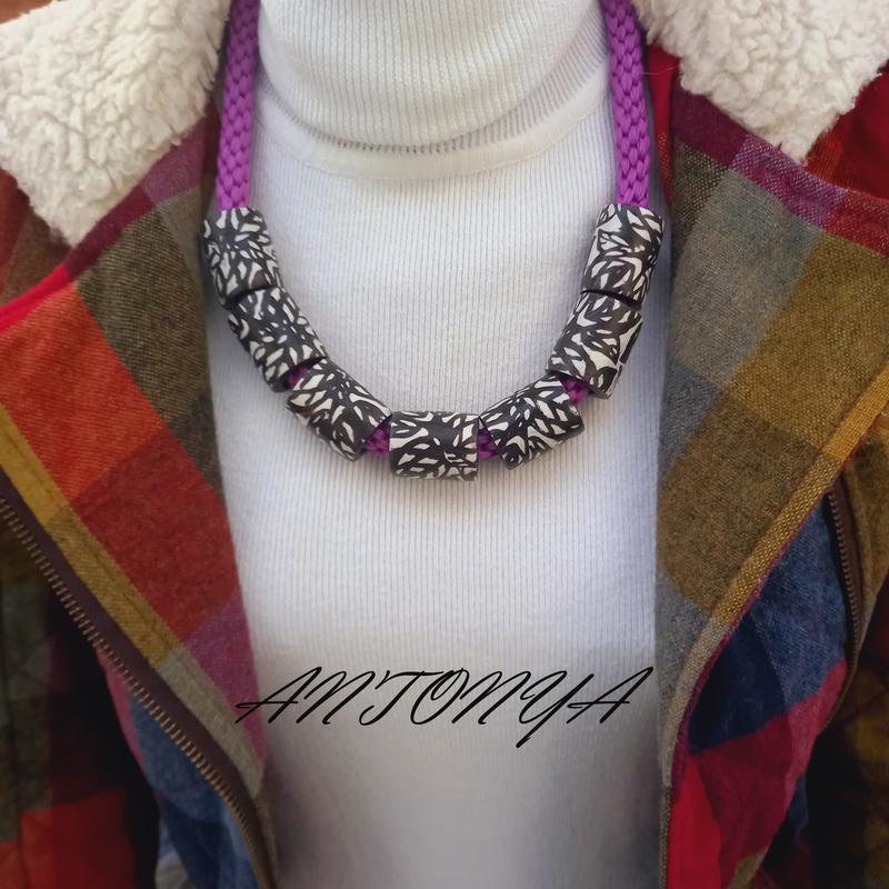 Стильное колье с бусинами-цилиндрами. Бусины-цилиндры выполнены из запекаемой полимерной глины. Длина колье около 50 см, плюс удлинительная цепочка 7 см. колье собрано на шнуре кумихимо ручной работы. Это колье -оригинальный и стильный подарок любимой девушке, жене, подруге, сестре на день рождения, на годовщину свадьбы, на юбилей, на 8 марта. Необычный подарок, дизайнерское украшение, эксклюзивный подарок, авторское украшение.