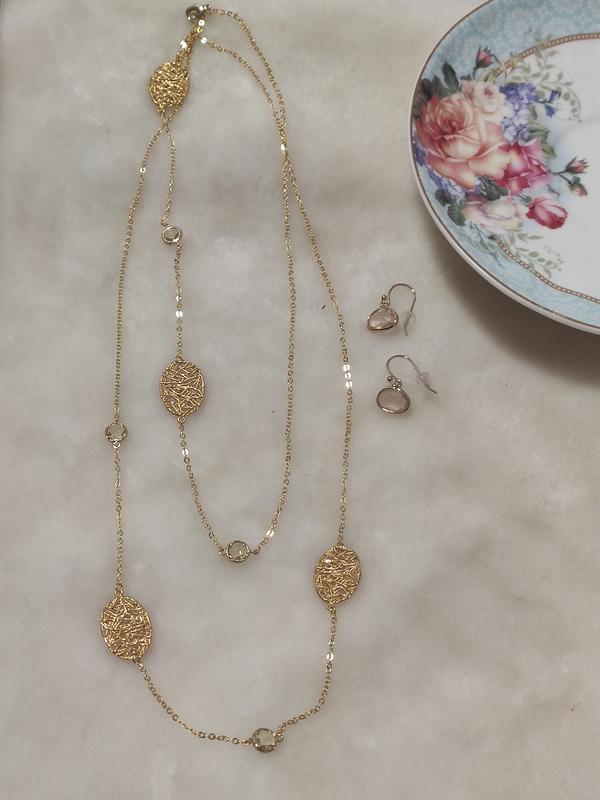 Продам очаровательные и нежнейшие-колье и серьги. Набор,украшен вставками граненного,стеклянного безеля. Безеля-имеют прозрачный,под хрусталь оттенок. Колье очень длинное,украшено безелями и золотистыми листиками.Комплект-отлично украсит,и придаст очарование- Вашему образу. Прекрасно подойдут на подарок,а также для встречи Нового года.Пересылаю.