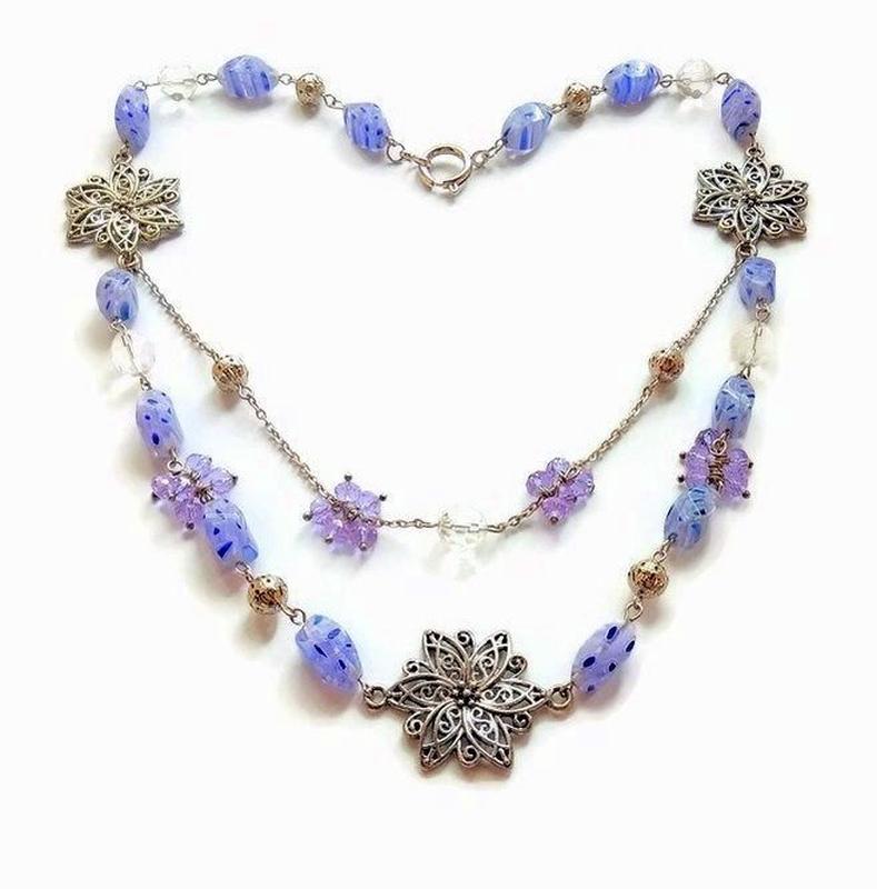 Шикарное и интересное двухрядное колье ручной работы, выполненное по авторскому дизайну. Для ценительниц неординарных вещей ручной работы. В единственном экземпляре, без повторов! В работе использованы красивые бусины-лэмпворк, хрустальные бусины, граненые стеклянные бусины, металлические бусины, цепочка, и очень интересные металлические коннекторы в восточном стиле, стилизованные под цветы, с рисунком филигрань. Длина колье - 60 см. Диаметр цветочных коннекторов - 3 см. *** По всем вопросам пишите в ЛС!
