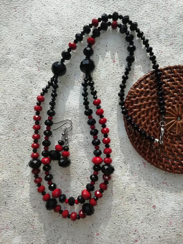 Довгі буси із чеського скла чорного і темнокрасного кольору, грані бусін виблискують. Довжина виробу 70 см. Ручна робота в єдиному екземплярі. Продаються разом з сережками, форнітура металева