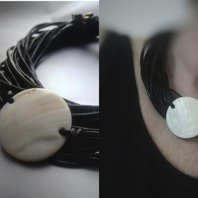 Стильное ожерелье под шею,авторская работа,исполнено из шнура качественного кожзама ,пластина из перламутра,металлическая фурнитура