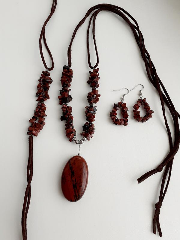 Шикарный набор состоящий из ожерелья,серёжек и браслета с настоящей яшмой на кожаном шнурке. Состояние идеальное. Приятных Вам покупок🌹🌹🌹