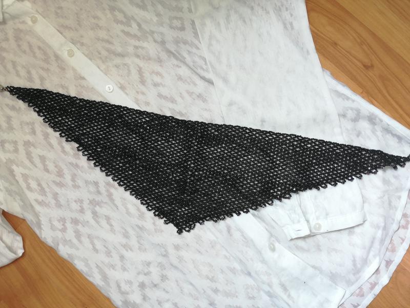 Ручная работа. Длина 54 см. По нижнему краю вплетены фиолетовые бусины более крупного размера, которые сверкают при прямом попадании солнечных лучей. Вживую выглядит дорого. Застежка имеет магнитный замок.