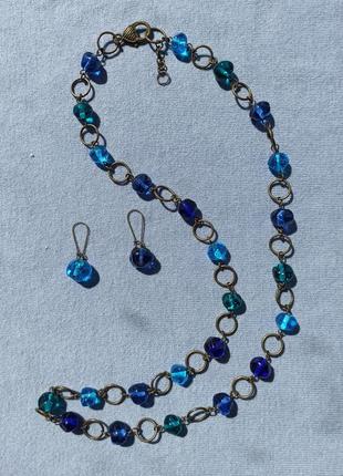 Бусы ожерелье и серьги стекло lampwork Авторская работа синий голубой бирюзовый 90 см
