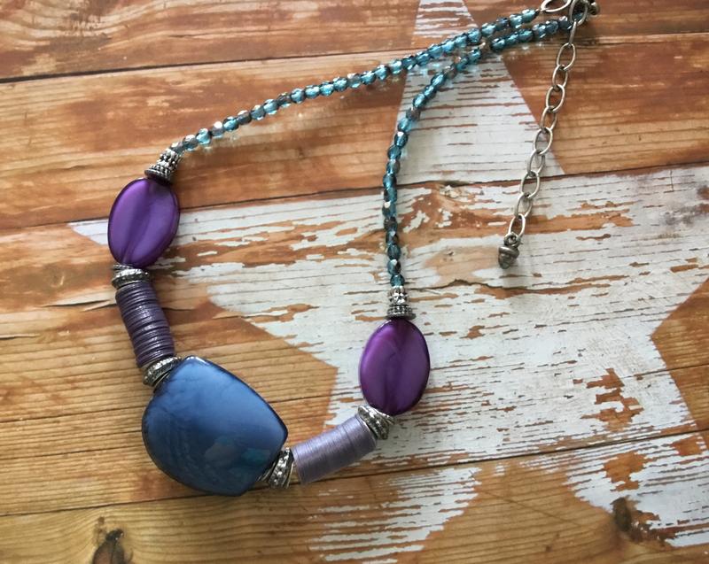 Длинна 36 см + дополнительная цепочка 5 см, изготовлена из стеклянных и пластиковых бусин. Центральная часть 16 см, центральная подвеска 4 х 3,5 см