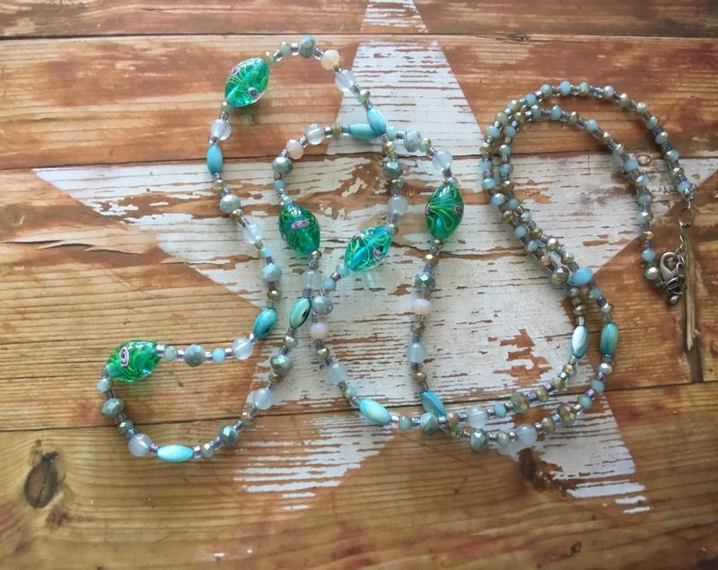 Длинна 48 см. Очень красивые бусины художественного стекла, украшают его . Сияния добавляют бусины сваровски