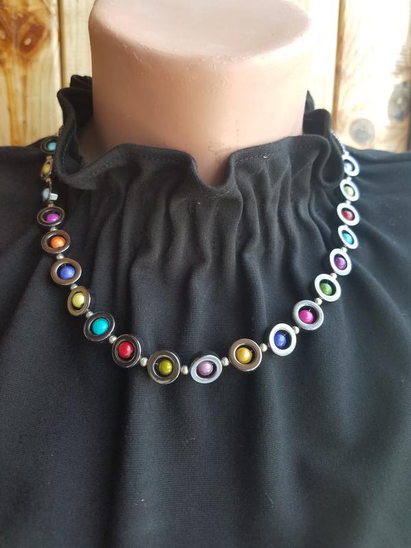 Необычное ожерелье ищ цветных бусин , каждая бусина закреплена в оправу из металлического сплава. На удилительной цепочке. Отправлю после предоплаты.