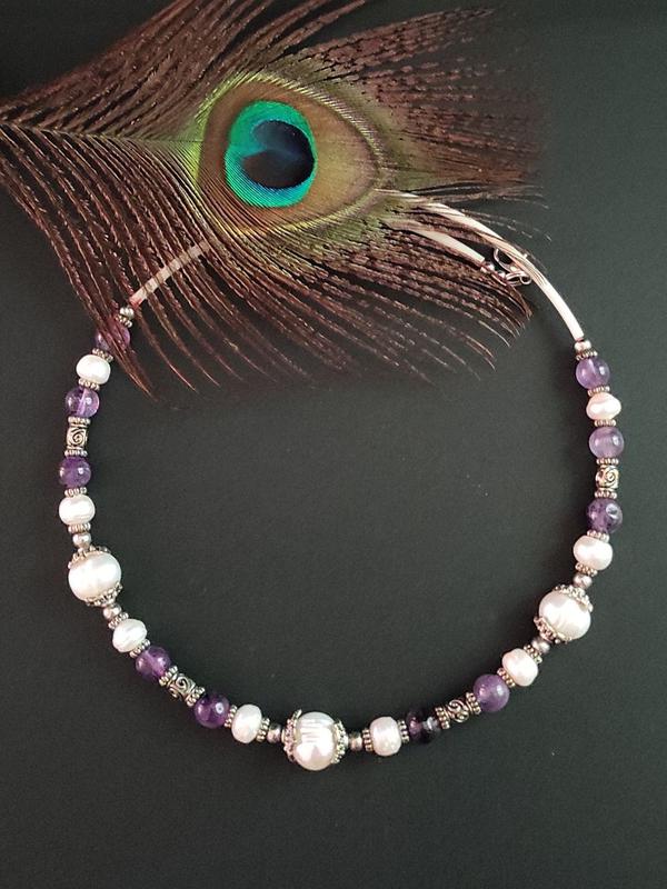 Стильное ,нежное,модное колье из аметиста, жемчуга натурального пресноводного, фурнитуры металлической цвета античного серебра, длина колье 46 см.К данному колье есть в наличии серьги и браслет которые можно заказать и купить за отдельную плату.Фото комплекта для примера .Обратите внимание на то что цвет изделия может отличаться от фото на сайте это зависит от настроек Вашего и моего монитора.