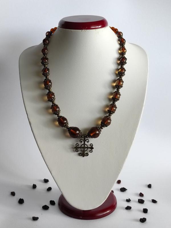 Янтарь (бакелит), бусины стеклянные, фурнитура металлическая бронзового цвета, длина бус 50 см.,+ удлинитель 6 см.Обратите внимание на то что цвет изделия может отличаться от фото на сайте это зависит от настроек Вашего и моего монитора.Могу к бусам сделать серьги.Если нужно то упакую на подарок.