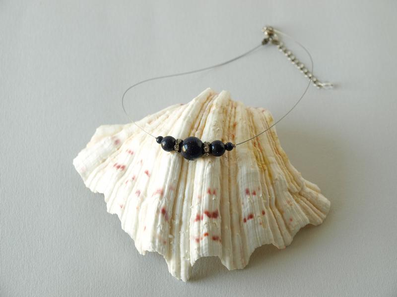 Ожерелье с Авантюрином (имитация) "Ночь Каира" Бусины глянцевые, холодные с глубоким синим цветом с блестящими искорками. Дополнит и праздничный и повседневный образ Основа - ювелирный трос из нержавеющей стали (струна) Диаметр бусин от 4 до 12 мм, ширина декоративной части 4 см Длина ожерелья 38+4 см