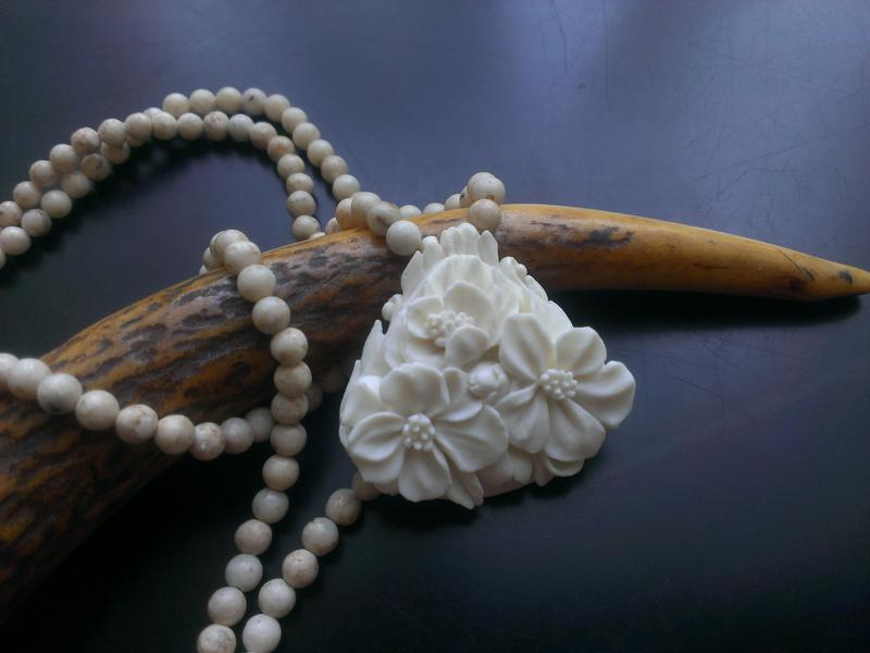 Красивое женское ожерелье из натурального камня с резьбовым костным кулоном, авторская работа Студия Алека, Украина. Размер кулона 3 сантиметра, длина ожерелья 58 сантиметров, диаметр бусин 4мм. Я не специалист по камню и могу ошибаться но похоже на говлит или кафелонг по вашему усмотрению.