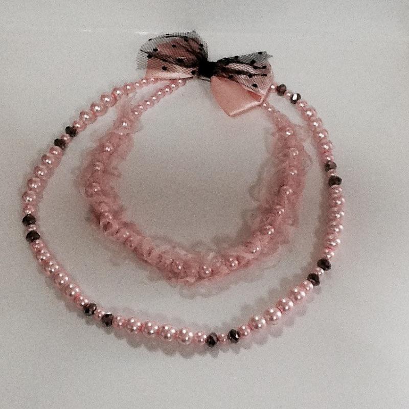 Жемчуг бижутерия , вставки блестящие бусины и розовое кружево . Модное , современное украшение , узнаваемое , модное . Подходит как для каждого дня , так и для особых случаев - к свадьбе невесте или для банкетного наряда . Длинные , есть возможность регулировать необходимую длину . Можно носить сложенными в два ряда . Застежка на спине прикрыта бантиком .