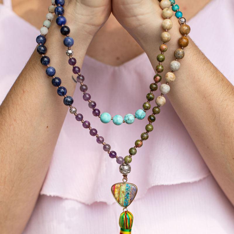 Размер: Приблизительно 85 см Цветовые Ожерелье - нить четок, состоящая из 108 драгоценных камней и используемая, среди прочего, буддистами для улучшения своих духовных практик. Чакры — это 7 самых важных энергетических точек в теле. Помимо того, что это красивое украшение, в нем царит определенный покой и умиротворение, потому что камни, вставленные в это ожерелье, защищают вас и придают вам ясность. Используйте ожерелье «Семь чакр», чтобы думать о чем-то прекрасном, или повторяйте утверждение для каждого драгоценного камня, как это делают буддисты. Каждый камень был тщательно отобран, и мы предлагаем только самые качественные драгоценные камни. Заказав ожерелье «Семь чакр», вы станете обладателем действительно единственного в своем роде изделия ручной работы! Материал: Яспис, Тюркис, Аметист, Родонит, Ювелирный металл Сделано с любовью!