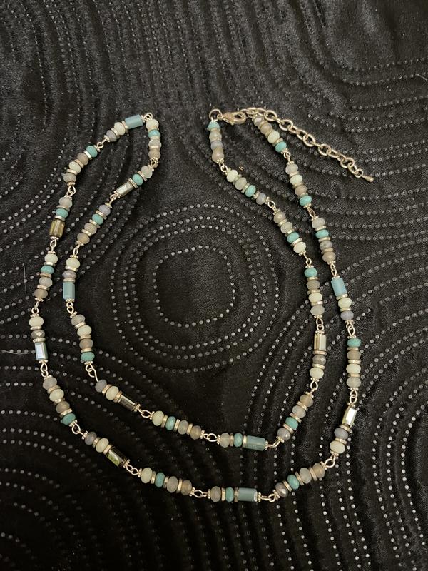 Ожерелье 89 см + цепь 7 см. Цвет белый, бирюзовый, серебристый.