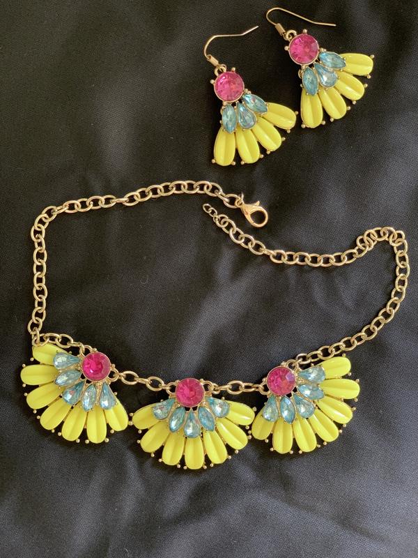 Новое ожерелье, все камушки целые, очень яркое, нарядное! Не легкое, вес ожерелья чуть более 50 грамм, одной сережки - 10 грамм. Длина ожерелья - 40 см, высота сережки - 3,5 см
