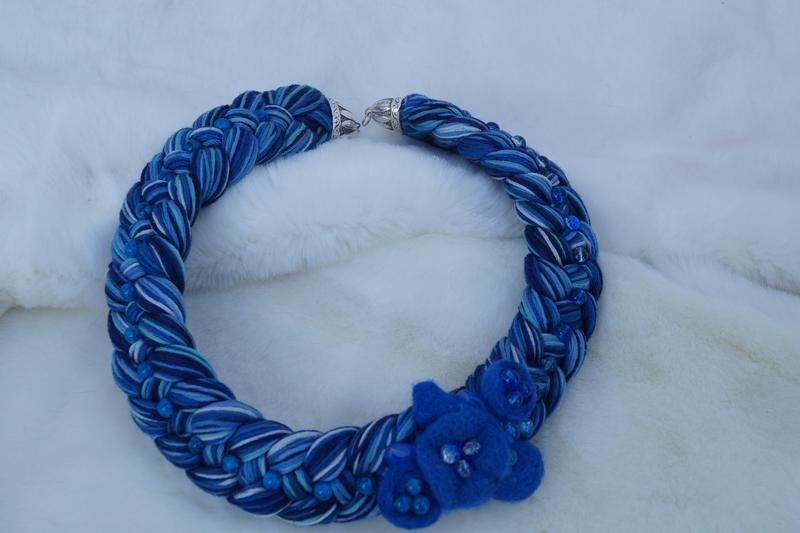 Колье Коса из хлопка ручной работы,украшено композицией из шерсти и стеклянных бусин.