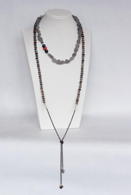 Намисто-трансформер можна носити як чокер, як подвійне намисто або як однорядне довге намисто з ланцюжком. Матеріали: лабрадоріт, пірит, чорні та білі перлини, коралл. Застібка - карабіни.