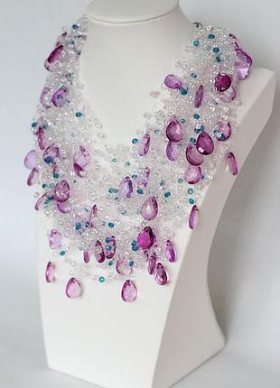 Повітряне плетене багаторядне намисто. Матеріали: бісер, скляні кристали, пластикові краплеподібні намистини. Застібка - карабін.