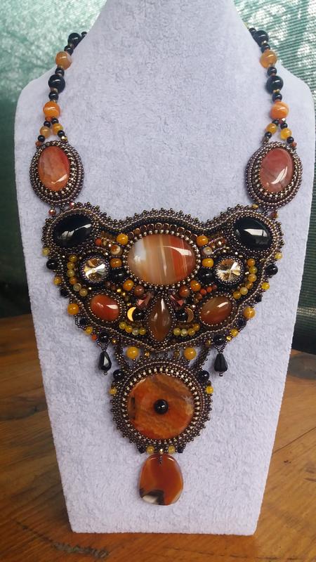Кабошони та намистини агату, скляні стрази та намистини, бісер чеський та японський, намистини гематиту, фурнітура під бронзу. Зворотній бік - натуральна шкіра. Довжина кольє по колу 50 см, довжина кулона - 16,5 см.