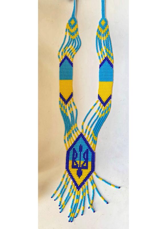 Ґердан жовто-блакитний з гербом України Ґердан - шийна бісерна прикраса у вигляді вузької стрічки, виготовленої з різнокольорових намистин, нанизаних на нитяну, чи волосяну основу, що утворюють строкатий геометричний орнамент