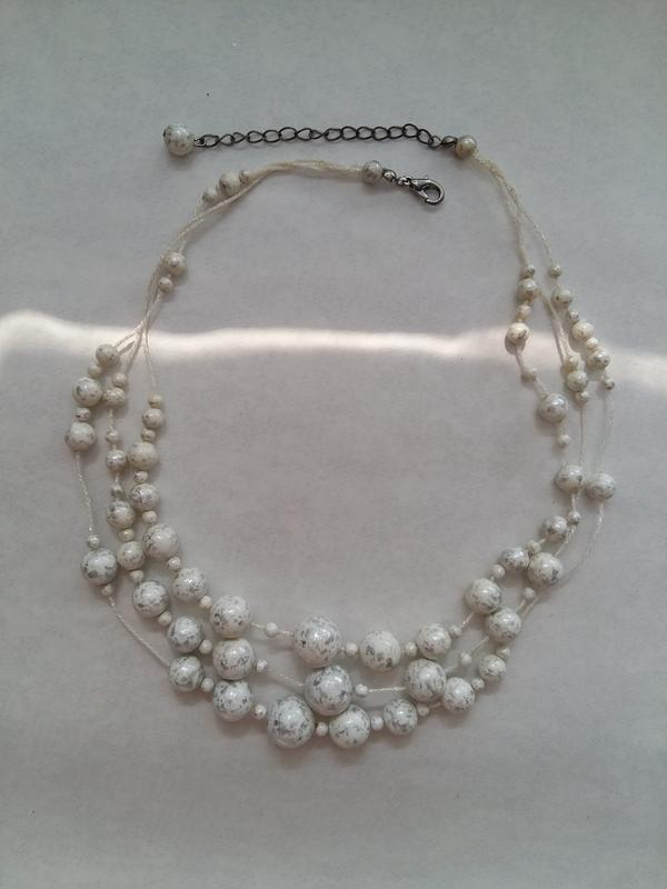 Женственные бусы, лёгкие, как облачко. Из белых бусин с серебристыми пятнами. Длина: 43-49 см
