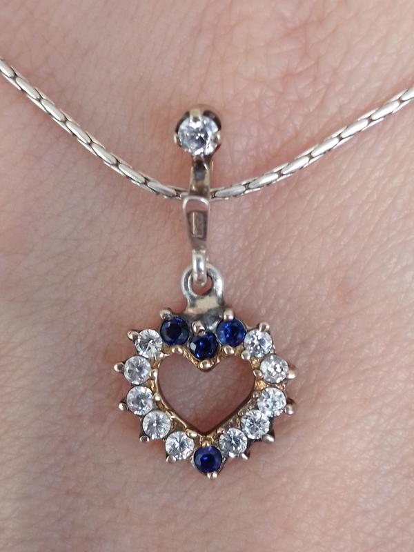 Очень утонченное и миниатюрное серебрянное колье под шею 925 пробы с элементами частичной позолоты, вставлены фианиты темно синего цвета под сапфир,при хорошем освещении оживают и становятся ярко синими на просвет,а прозрачные фианиты очень хорошей чистоты и у них просто брилиантовое мерцание (длина цепочки 41 см,само сердечко 1/1 см + ушко 1 см,а весь кулон 2 см и 3 мм,замок на цепочке отлично работает,состояние ИДЕАЛЬНЕЙШЕЕ ).Это колье было сделано под заказ и другого такого нет.Оно универсальное, подойдет как для девочки так и для юнной леди,а также для всех любительниц миниатюрных украшений.Дополнительные фото и отвечу,по запросу.Отсылаю: новой почтой и укрпочтой.Пишите в личку,так как на звонки,я отвечаю крайне редко(спицыфика работы). Интересуйтесь.