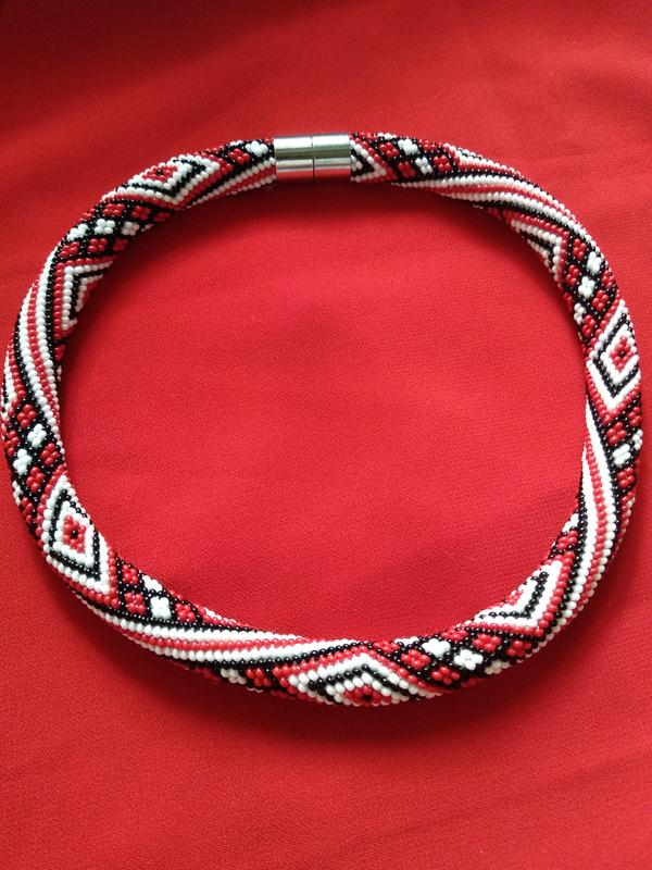 Джгут зв'язаний з чеського бісеру. Довжина з магнітною застібкою 44 см. Можлива застібка з карабіном. Тоді загальна довжина буде 49 см. Товщина джгута 12-13 мм. Коло на 16 бісерин