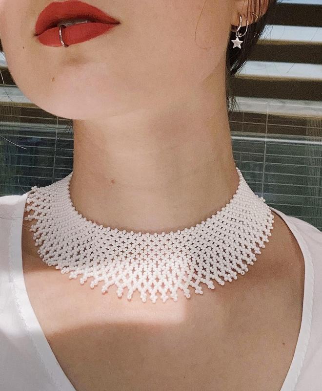 Етнічна українська оздоба - силянка. Виконана в мінімалістичному стилі з чеського бісеру. Застібка: металевий карабін та кільце. Довжина: 25 см з внутрішнього боку, 38 см із зовнішнього. Ширина: 3,7 див.