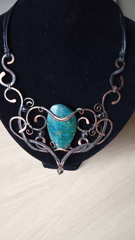 Колье ручной работы из черненной меди. Вставка натуральный фуксит, бусины из раухтопаза( дымчатый кварц). Колье на кожаных шнурах. Диаметр колье 48 см. Размер камня 5,5*3,5 см.