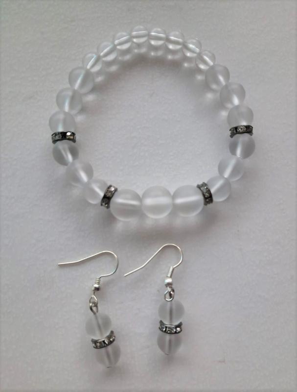 Набор из горного хрусталя натурального прессованного матового, бусины 6 - 10 мм, стразы черные / белые, металл бижутерный Браслет на резинке / 195 грн ( изготовлю ваш размер) серьги со швензой ок 4 см / 125 грн возможны варианты, доп. фото по запросу возможны варианты из других бусин 6 -10мм лунный, хрусталь два вида, шунгит, раухтопаз доп. фото по запросу