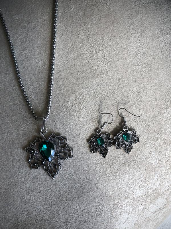 Шикарний набір із смарагдовим камінчиком. До набору входить підвіска, ланцюжок і сережки.