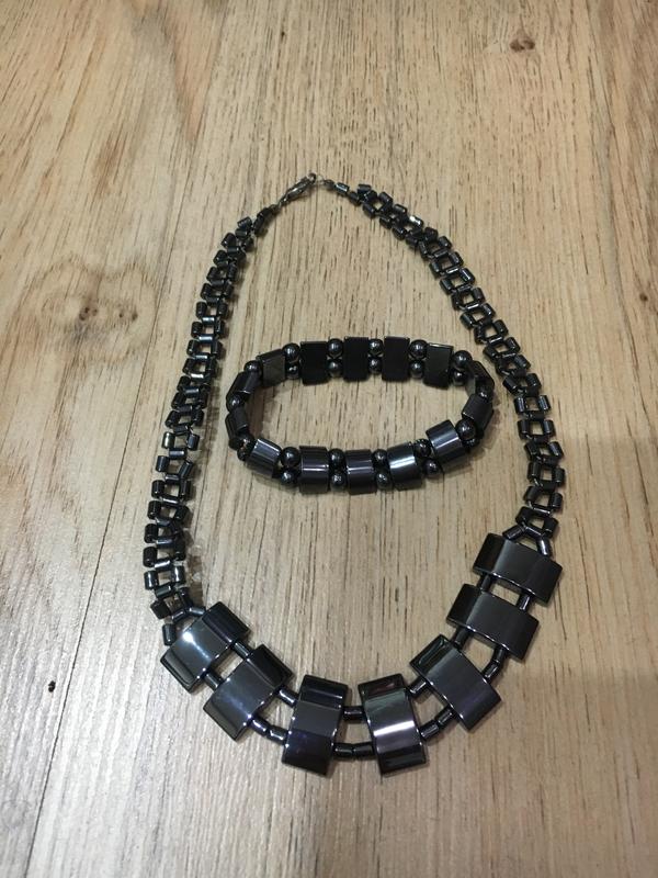 Стильный набор из камня гематит. Основные целебные свойства гематита связаны с его воздействие на кровеносную систему человека. Он чистит кровь, укрепляет сосуды, нормализует уровень гемоглобина. При ранах и порезах гематит останавливает кровотечение, снимает воспаления и способствует быстрому заживлению. Кроме того, минерал обладает тонизирующим действием на организм и способен поднимать артериальное давление, поэтому он рекомендован людям с пониженным давлением, а вот гипертониками стоит носить его с осторожностью. Длина колье - 43 Диаметр браслета - 8,5 см (на резинке)