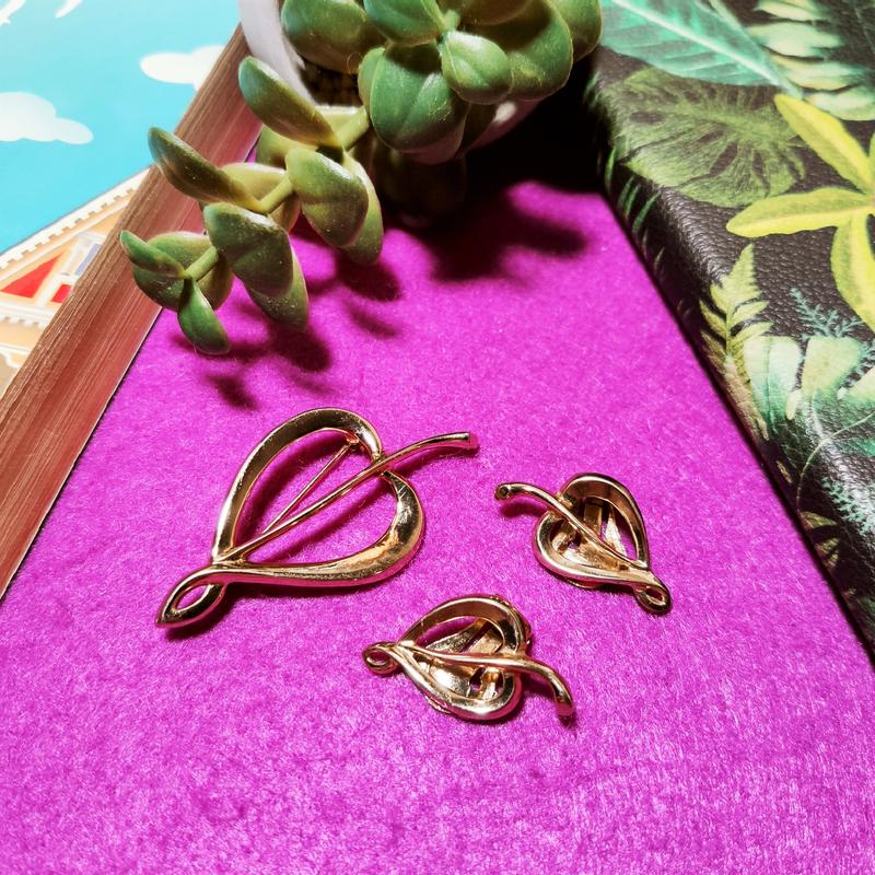 Нежный винтажный гарнитур 60-70-х годов. В набор входит брошь и клипсы в виде силуэтов листьев. Основа - увесистый бледно-золотистый сплав. Украшения без маркировки. В очень хорошем состоянии. Размер броши - 3 х 5,7 см, клипс - 1,7 х 3,2 см. Прикреплен видеообзор.