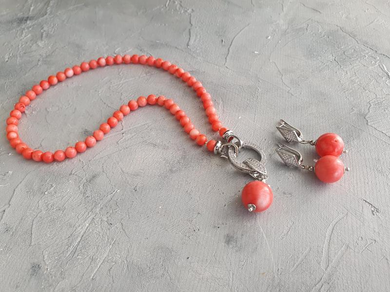 Комплект 'Розовый коралл': бусы и серьги. Комплект ручной работы! На этом сайте ************************ представлены украшения ТОЛЬКО ручной работы!! Колье с необычным замочком, качественная фурнитура. Подвеска съемная, можно носить по отдельности. Бусины в серьгах и подвеске 13 мм. Фурнитура гипоаллергенна, не чернеет. Серьги общей длиной 3.5 см Длина колье 42 см. Отличный подарок для девушек всех возрастов! Если что-то понравилось из комплекта отдельно, то прошу писать в личные сообщения. Обращаю Ваше внимание, что кораллы натуральные, они ячеистые, поэтому на бусинках могут быть отверстия естественные и не однотонный цвет. Это не считается дефектом изделия!