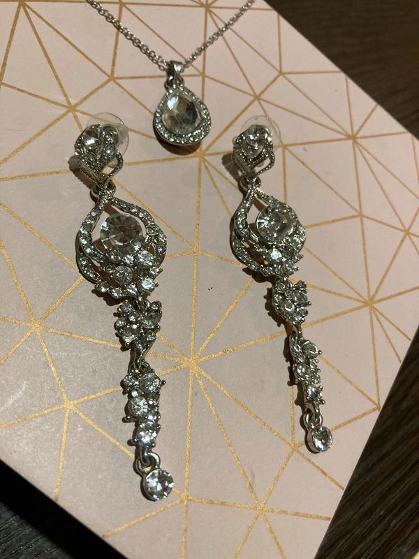 Прикраси підійдуть для весілля, випускного, або просто під вечірнє плаття. Надягала один раз на весілля. Не потемніли, всі камені на місці Довжина сережок 7,5-8см приблизно Довжина ланцюжка регулюється від 40 до 45см Кулон 2см