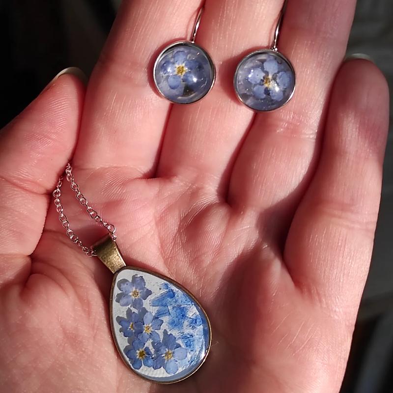 Кулон та сережки з епоксидної смоли. Виконані з натуральних квітів незабудок,та скла. Фон акрилова фарба. Метал медична сталь. Ланцюжок срібло 925 проба. Довжина 45 см. Можна придбати набір,або окремо.