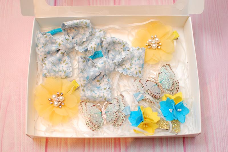 Набор украшений выполнен в желто-голубом цвете. Отличный подарок на день св. Николая, Новый Год, Рождество, день рождения и др. Набор состоит: 1. бантики из цветочной ленты (основа - резинки) размером 10,5*7 см 2. заколки с шифоновыми цветами диаметром 5,5 см 3. заколки с бабочками 5,5 см. 4. заколки с цветами из фоамирана Все украшения упакованы в праздничную коробочку размером 20*15*3 см.
