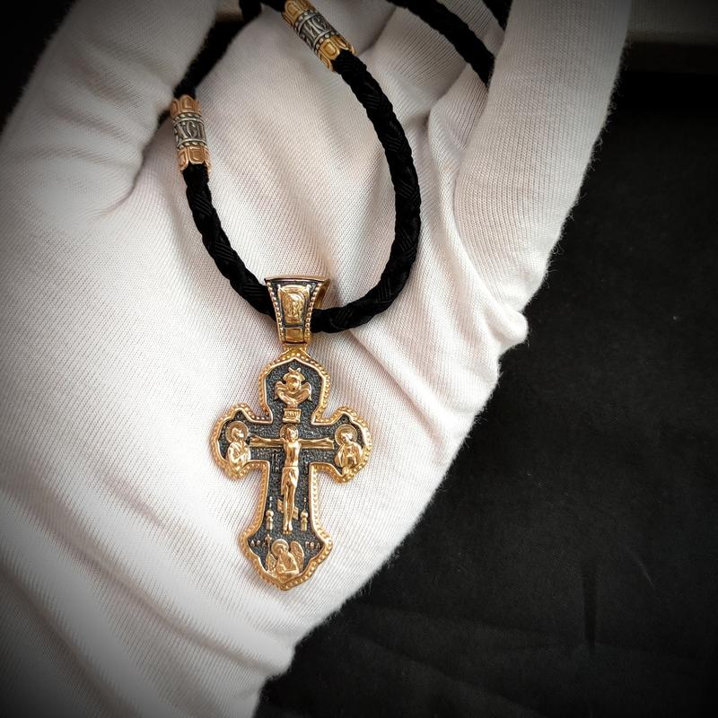 У нас вы можете купить шнурок с серебряными вставками и окончаниями покрытые износостойким слоем позолоты, а так же в комплекте с крестом. Шнурок сделан из качественного текстиля - нейлона. Окончания закреплены штифтами, поэтому можно не снимать изделия при контакте с водой. Все наши ювелирные изделия, изготовлены из серебра 925 пробы, специалистами с многолетним опытом работы. Так же изделия из серебра отлично подойдут как подарок не только себе, родным и близким вам людям, а и коллегам или деловым партнерам. Наша команда стремиться сделать ваши ювелирные покупки комфортными и приятными, что бы хотелось вновь и вновь возвращаться за ценными сюрпризами. Металл: Серебро 925 Вес креста : 10 гр Вес шнурка: 10.2 гр. Размер: 45-70 Покрытие: Чернение,Позолота Изделие будет упаковано в подарочный пакетик.