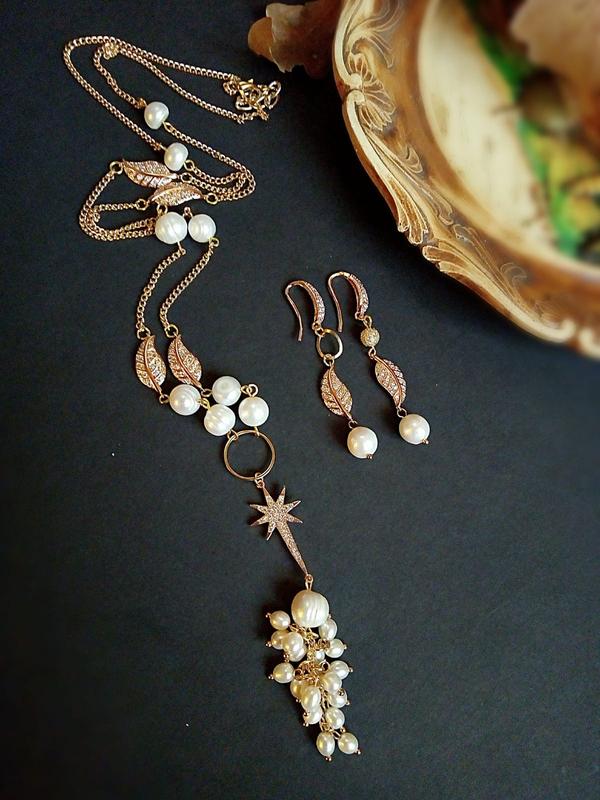🙌☀️ Авторский сотуар в позолоте с серьгами из натурального жемчуга. Фурнитура позолота 24 К инкрустирована фианитами. Прекрасные жемчужины, с оглушительным блеском, так прекрасны и изысканны. 👌 Как и классическая музыка, кино, произведения искусства и слова love you – всегда желанные и ценные! 💖 🌟 ⚪🌟Материал: натуральный жемчуг, позолота 24 К 📐 Длина: 60 см