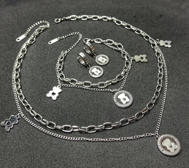 🐻Ювелирная сталь, Перламутр❤️🔥 🔸 Размер серег 3см. 🔸 Длина браслета 17+5,5см удлинение. 🔸 Длина Колье 40+6см удлинение. Цепочки между собой соединены. 🔸 Монета -подвеска 1.8 см. Мишка -подвеска 1,5см.