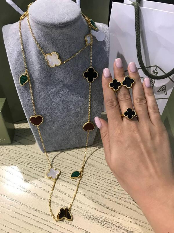 Набор vancleef/ ванклиф в позолоте: подвеска с разноцветными кулонами, кольцо и серьги с ч...