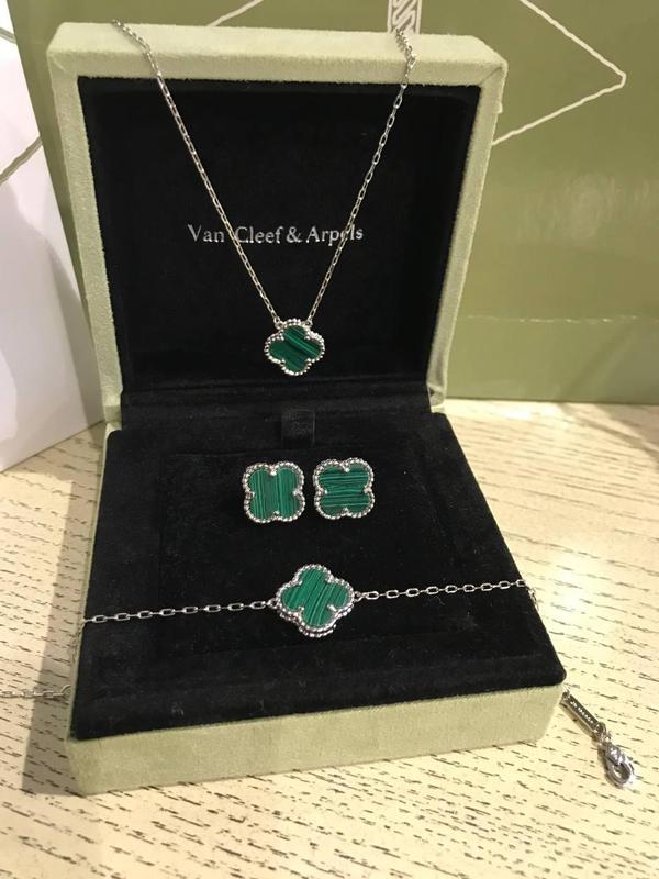 Набор vancleef/ ванклиф зеленый (малахит) в позолоте: подвеска с одним клевером, серьги и...