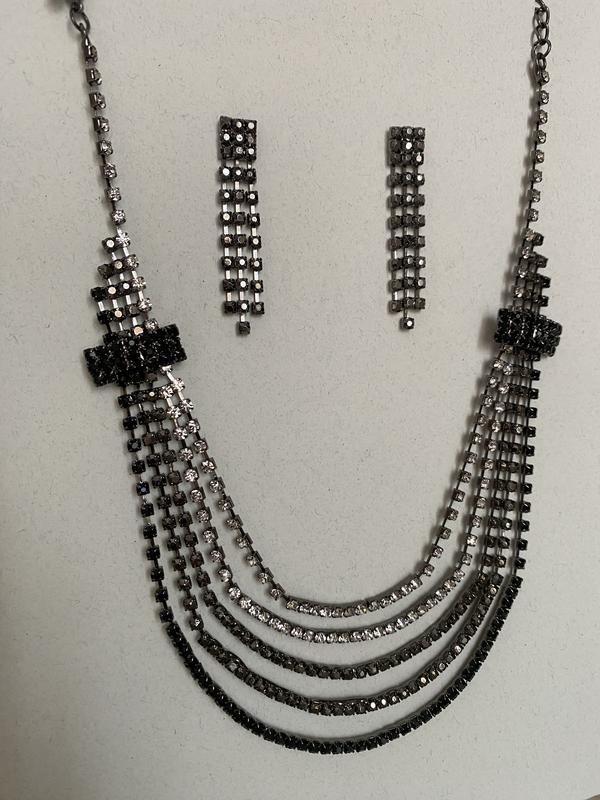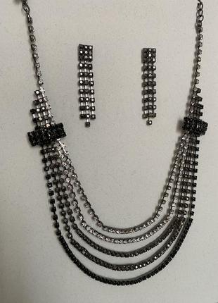 Сияющий набор украшений, колье и серьги, сочетание черных, темно серых и белых камешков, и серой фурнитуры, состояние нового, очень красиво переливается