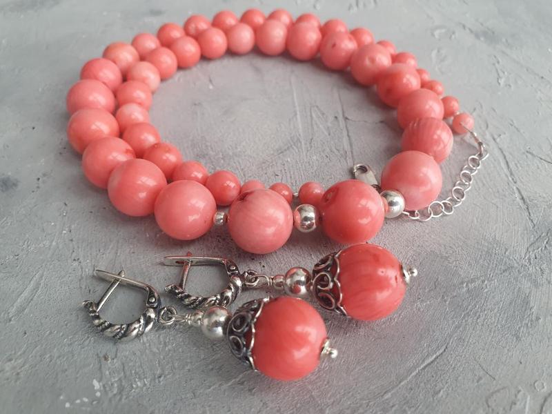 Бусы и серьги "Розовый коралл" в серебре При заказе Вы поучаете именно то украшение, которое на фото. Длина ― 47 см + 5 cм серебряная удлиняющая цепочка. Замок карабин - серебро 925 пробы. Кораллы разного размера, очень красивого лососевого цвета. Размеры кораллов - 14 мм, 13 мм, 12 мм, 10 мм, 8 мм, 6 мм. Весь металл в бусах- серебро. На бусинах есть небольшие естественные отверстия, это не считается браком. Длина сережки - 3 см. Размер бусины 13 мм. Швензы - серебро с чернением На сережках есть природные отверстия. Как хранить и носить кораллы Мода на коралловые украшения дошла даже до расположенной далеко от места их добычи Украины, где нить красных кораллов раньше украшала одежду каждой женщины. И сегодня это атрибут костюма в народном украинском стиле. Не одна украинка может похвастаться нитью бабушкиных кораллов. Но мало кто обладательницы украшений с кораллом знают, что они очень капризны. Кораллы не любят высокой температуры, горячих ванн. При носке могут выцветать, бледнеть. Коралл обладает невысокой твердостью и может царапаться даже бытовыми металлическими предметами. Кроме того, он хрупкий, от ударов может крошиться и раскалываться. Кораллы - это всегда модно, актуально, неординарно.