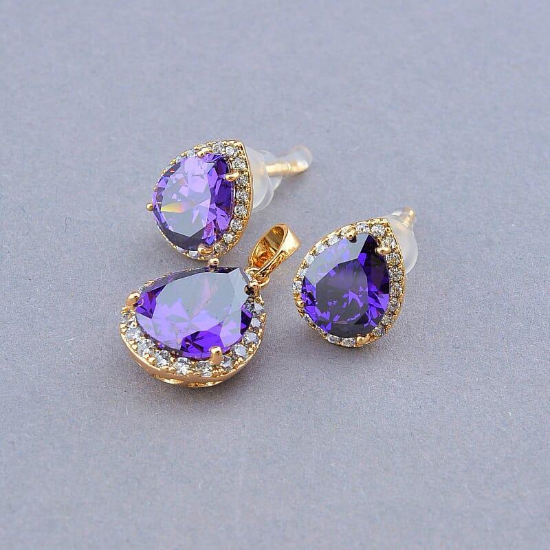 Артикул: 099458 Размер серьги: 12х10 мм. Бренд: XUPING Тип замочка: Пусет Диаметр: 4 мм. Материал: Медицинский сплав Покрытие: позолота 18к Качество: Не темнеет, не облазит Камень: Фианит(нат.) Цвет: Фиолетовый Цвет2: Хрустальный Цвет3: Золотой Вес: 7,01 г.